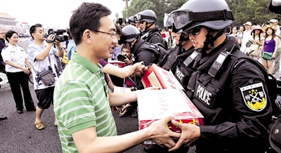 昨天下午,李瑞英、朱军、郎永淳等中央电视台和北京电视台的十多位名嘴,为正在执勤的特警队员和交警,送去酸梅汤等夏季消暑饮品。近日,市公安局巡特警总队,在长安街沿线及重点地区加强了巡逻防控和武装震慑。据了解,特警们每人每天身上的枪支、防弹衣等装备,需要负重数十公斤。“高温酷暑,特警们还着装整齐,一站十多个小时,他们确实是最值得尊重的。”朱军说。 记者 董世彪 郭晓乐 摄影报道