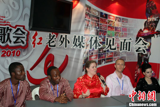 中新网南昌7月10日电(刘占昆)2010中国红歌会突围战即将全面打响,10日下午,闯进全国120强选手中的五位老外率先亮相在媒体见面会上,他们不仅现场唱起红歌,还相互调侃耍宝。