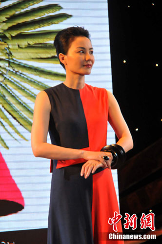 脚踩透明人字拖凉鞋缓缓上台,王菲身着一袭红黑相间的无袖长裙,秀发高高盘起,整个人显得愈加消瘦和飘逸,左手无名指戴着与李亚鹏的结婚戒指,右手一颗巨大夸张的戒指,造型十分清新脱俗,媒体镁光灯也随之不停地闪烁。