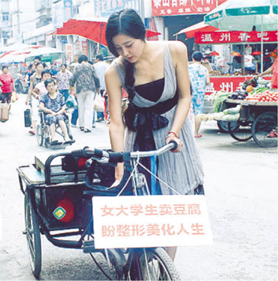 中新网7月23日电 “女大学生卖豆腐,许昌老豆腐,新鲜美味好吃不贵!”前天上午,河南郑州市法院西街一个街市内,一名打扮时尚、样貌酷似范冰冰的美女推着三轮车沿街叫卖豆腐,引得众人围观。她说从小就想做演员,但试镜公司嫌她眼睛不好看、胸小,她希望藉卖豆腐“炒作自己,挣钱整容”。