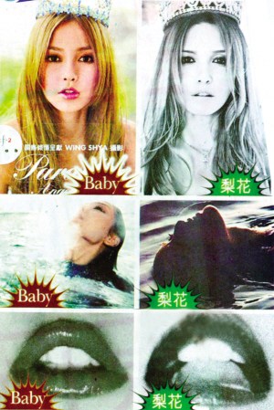 对比二人的写真照,当中Angelababy头戴皇冠的封面及内页的黑白嘴唇特写,与梨花的相似度达9成!而侧面的出水芙蓉照、戴皇冠的回望照及黑帽魔术师照,无论造型与拍摄角度亦有8成半相似。