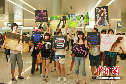 赤雪黑衣甜美空降上海 粉丝疯狂激动引发骚乱(图) (2)