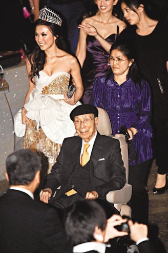 中新网8月2日电 据香港“文汇报”消息,“香港小姐选举”是TVB一年一度重头节目,老板六叔邵逸夫每年都亮相,昨晚六点多邵逸夫在夫人方逸华陪同下出现红馆,邵逸夫头戴格子帽,乘车到场,神采奕奕,下车时还带笑挥手,然后与去年港姐冠军刘倩婷、亚军李姿敏、季军熊颖诗合照,之后邵逸夫由一名护士推着,在6名保安护送下入场。