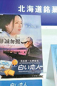 舒淇主演的《非诚勿扰》去年在中国创下惊人票房,带动取景地日本北海道观光人潮,旅游业者趁势推出电影套装行程,当地名产“白色恋人”饼干更把海报当免费宣传,在当地随处可见,连名古屋机场也看得到,可说是扬威日本。