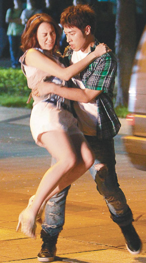 为了躲避黑道追杀,潘玮柏(右)英雄救美,把张榕容(左)抱在怀里