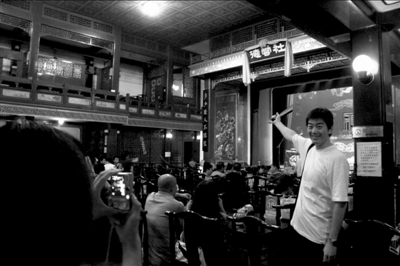 晚上7点半,演出正式开始,德云社元老邢文昭先生表演单口相声《文昭关》。此时上座率刚刚过半,观众都很安静地听相声,邢先生抖包袱后,大家也是试探着“噫”了几声,反倒是邢先生挺放得开,“叫好就痛快点”。德云社门前停着于谦的座驾,但在后台,记者没有看到他和郭德纲的身影。
