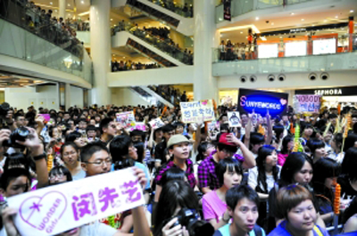 发布会现场,连楼梯上都站满了歌迷。本报记者 郭延冰 摄
