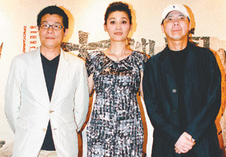 《唐山大地震》导演冯小刚(右起)、徐帆及王中军昨天出席首映会。(图片来源:台湾“联合报”)