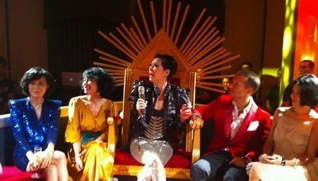 刘嘉玲(蓝衣)、关之琳(白衣)与王菲坐在一起