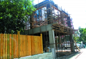 近日,该小区3区19号1栋正在装修,工人在楼外围起栅栏,占用人行道和公共绿地,并在其房屋后门外加盖两层建筑。业主称加盖后将严重影响邻居采光。