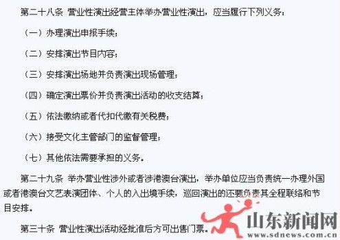 根据我国09年出台的最新《营业性演出管理条例实施细则》第二十八条规定,营业性演出经营主体举办营业性演出,应当履行办理演出申报手续、安排演出节目内容、接受文化主管部门的监督管理等义务。紧接着,第三十条规定,营业性演出活动经批准后方可出售门票。在《细则》中还明确指出,跨省区演出的,应当出具其他演出所在地省级文化主管部门的审核意见。