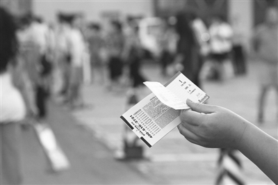 13日下午,记者在剧场外面遇到不少“黄牛”,他们手中拿着不少门票向记者推销,从高价位的980元、780元到贴有“赠劵”标识的工作票。当时“黄牛”们开的价是原票价加上100元,经过几次还价,一位“黄牛”主动降到只加30元。