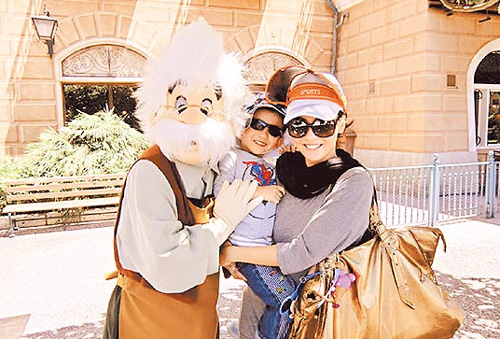 张柏芝(右)抱着Lucas与迪士尼的卡通人物合照
