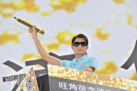 郭富城乘坐升降台,为悬挂半空的户外巨型海报签名