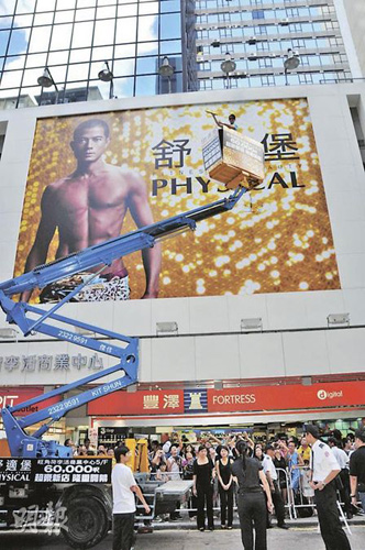 郭富城走上预先准备的吊车升降台,升到4楼高的户外巨型广告海报外。
