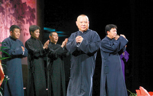 郭德纲、于谦合作10周年专场演出14日如约开场,现场座无虚席。此番亮相的郭德纲显得颇为低调,他在对话中表示,自己只是一个说相声的,“能力有限,水平一般”。此次演出郭德纲个人为舟曲灾区捐出了10万元,德云社和演出承办方也各捐出5万元,对于因为哀悼日而暂停的15日的演出,郭德纲表示:所有15日票的观众都可以去退票,也可以留着,等我们开演的时候继续使用。现在不是我们不订演出时间,实在是北展后面的演出太多了,一切需要重新协调。”