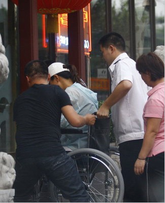 潘蔚顺利下车后,保姆推着轮椅走残疾人通道将其推到了烤鸭店门口——原本保姆是想走侧门,不过到了门口才发现轮椅太宽并不能通过。见此情景,跟随潘蔚而来的两位男士又在店门口保安的帮助下将其抬到正门才最终顺利进入。