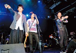 宇豪(左起)、张杰、弹头在“决斗巴哈演唱会”上劲歌热舞