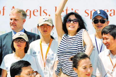 8月26日,在北京,李亚鹏、王菲夫妇携女儿窦靖童出席嫣然天使基金医疗救助启程仪式。天后王菲身穿条纹短褂,显得相当清凉。在活动现场,心情大好的她不忘向镜头大力挥手,呈现出天后酷酷外表下率性热情的一面。