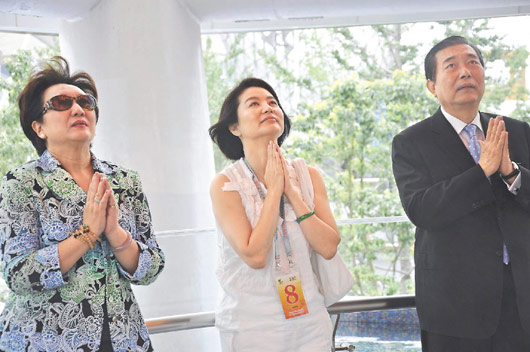 林青霞在点灯祈福水台,仰天双手合十祈愿,许下“愿民平安”的心愿,王志刚送给林青霞限量天灯拼图徽章及天灯杯,也让林青霞爱不释手。