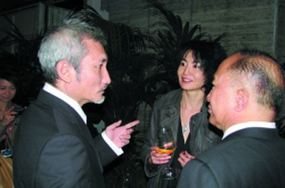 在酒会上张曼玉和徐克(左)、吴宇森(右)聊得很欢。