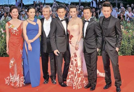 《狄仁杰之通天帝国》威尼斯影展首映,施南生(左起)、刘嘉玲、徐克、刘德华、李冰冰、制片人王中磊及邓超盛装出席。
