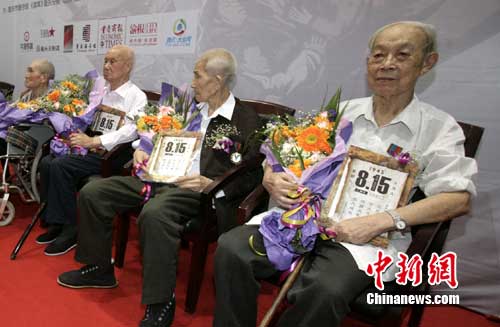 9月11日,央视名嘴崔永元携八名耋耄抗战老兵到重庆宣传《我的抗战》,老兵收到纪念抗战胜利65周年“8•15”纪念卡片和鲜花。 作 者:连肖