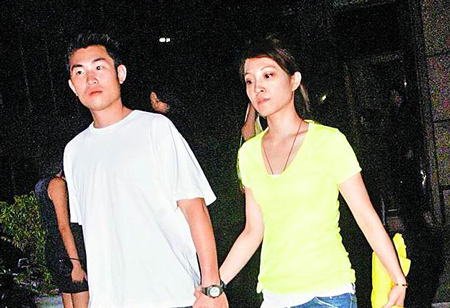 蔡依林姐姐蔡旻纹(右)和老公林传凯穿白T牛仔裤情侣装,牵手步出夜店,见记者拍照快闪不受访。