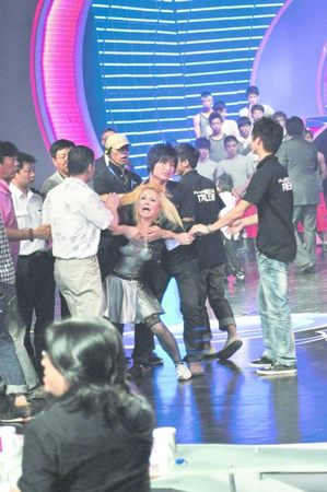 湖南卫视的《快乐男声》刚刚落下帷幕,东方卫视的《中国达人秀》即将迎来高潮。不过,在前日举行的《中国达人秀》首场半决赛中却发生了意外状况,被淘汰的选手陈静大闹现场,最终周立波动用了自己的保镖才将她和她的丈夫请出舞台。而一旁的评委高晓松说了一句“上海男人怂”,也惹得众多网友不满。昨日,这段从节目中删除的视频流传到了网上,成为网友热议的焦点。对于选手的偏激行为,昨日《中国达人秀》的宣传总监陆伟解释说:“陈静未能晋级的失望心情我们可以理解,但她在现场选择这样的方式来发泄,显得有些过激,因此在节目最后公开播出的版本中,删去了这段实况。”