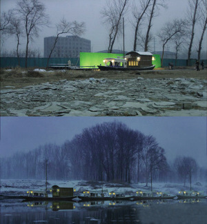 最后一集,贾政乘着小船送灵柩回老家安葬,远处被茫茫白雪掩盖。实际上,景取自冬天京郊的温榆河畔,而船根本就是在陆地上拍的。