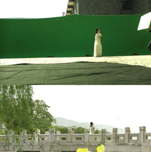 宝钗扑蝶。先是在绿底拍人物,之后再将人物合成进取自北海的景物中。