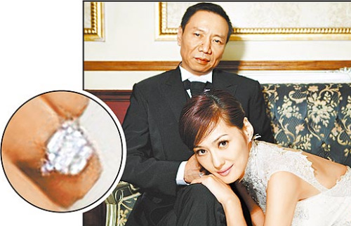 孟广美(右)幸福的趴在未婚未的腿上,婚戒是7.76克拉Harry Winston经典祖母绿型切工的钻戒,约3300万元(小图)。