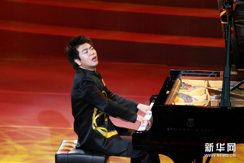 10月1日,在世博中心举行的中国国家馆日文艺晚会上,郎朗弹奏《我的祖国》。新华社记者任珑摄