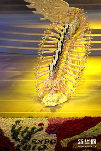 10月1日,在世博中心举行的中国国家馆日文艺晚会上,来自中国残疾人艺术团的演员表演“千手观音”。新华社记者凡军摄