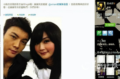 “我现在很开心,很幸福,之后的路就交给上天来安排吧”;“谢谢大家的祝福,我会努力让她开心快乐”……10月10日晚,在这个“十全十美”之日的最后一小时,阿Sa(蔡卓妍)与同门师弟陈伟霆几乎同时发微博,大方坦白了两人的恋情。年初刚宣布与郑中基离婚的阿Sa,坦承自己是在工作中对陈伟霆日久生情;而比阿Sa小三岁的陈伟霆也不惧外界压力,直言对方就是他的结婚对象。