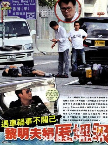 国庆期间,黎明乐基儿夫妇齐放假,两人相约多年老友、赛车手关兆昌和雷颂德等到跑马地饭聚。喝完红酒抽完雪茄的黎明,满脸通红,乖乖做乘客由司机接载离开。途径太子道东时,一行人目击车祸,“车神”关兆昌第一时间下车施以援手,但黎明夫妇俩却安坐车厢内当“看秀”一样。