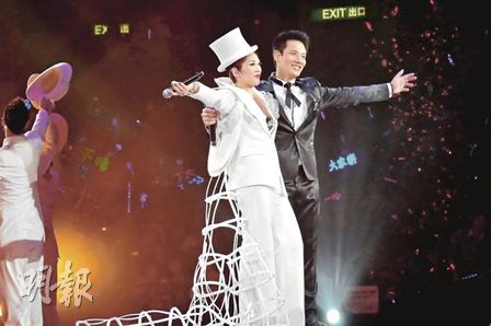 据香港“明报”消息,前晚当杨千嬅穿上白色婚纱礼服献唱《真命天子》时,荧幕上播出丁子高的照片,全场已经哗声四起,继而千嬅唱《飞女正传》,丁子高就在此时从另一面上台和她合唱,全场哄动,观众掌声雷动欢迎准新郎丁子高。