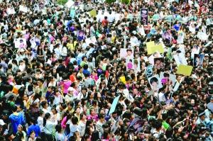 尽管这场原定于9月举行的签售会因故推迟,但重庆的快男粉丝并未消减热情。昨日,下午1点左右,签售现场就聚集了近万人。