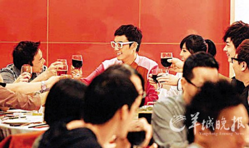 在朋友的起哄下,两人共同举杯“还礼”