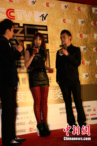 中新网10月19日电(张曦) 昨晚(18日),第10届CCTV-MTV音乐盛典在北京五棵松体育馆举行。韩庚、萧亚轩、张惠妹等明星齐聚一堂,红地毯上星光熠熠。尽管天空下着小雨,但是女星们依然狂秀性感,脚踩高跟鱼骨鞋的萧亚轩更是自称身穿“防狼服”。