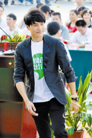 10月17日下午,大众电影百花奖“新科影帝”陈坤来到广州,在白云会议中心参加“绿色出行”公益活动启动仪式。