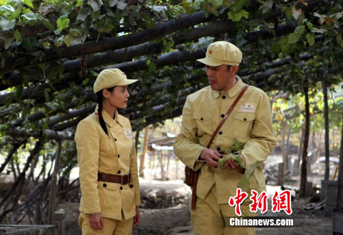 中新网新疆叶城10月21日电 长篇电视连续剧《雪浴昆仑》(又名《阿里阿里》)目前正在新疆叶城热拍。拍戏期间,男主角刘钧与女主演汤嬿二人能够在葡萄树下“谈谈情说说爱”,乐得轻松自在。