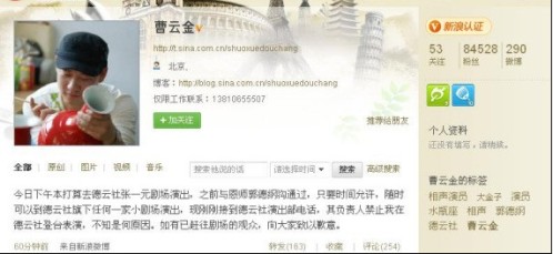 曹云金在浪微博称,“今日下午本打算去德云社张一元剧场演出,之前与恩师郭德纲沟通过,只要时间允许,随时可以到德云社旗下任何一家小剧场演出,现刚刚接到德云社演出部电话,其负责人禁止我在德云社登台表演,不知是何原因。”