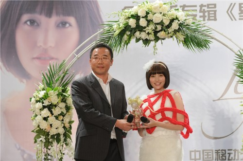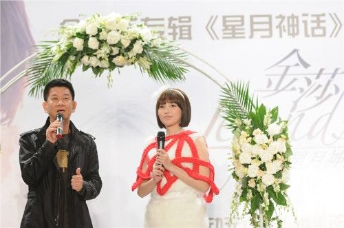 26日下午,金莎身穿白色“兔毛裙”搭配别致红色披肩亮相北京某高档酒店大厅,为自己第四张个人专辑《星月神话》召开新闻发布会,一上台便带来自己为电视剧《神话》创作的红歌插曲《星月神话》将气氛直接推向高潮,使得现场歌迷顿时沸腾,齐刷刷的“金莎加油”也让金莎很是感动。