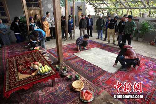中新网叶城10月27日电(记者 刘新)日前,长篇电视连续剧《雪浴昆仑》剧组来到新疆叶城县伯西热克乡巴什喀拉巴格村拍摄外景。剧组在该村选择了两家维吾尔庭院,分别作为剧中人物乔阿梅和乔阿凤的居所,并根据剧情需要在该村中选择部分道路、建筑进行外景拍摄。
