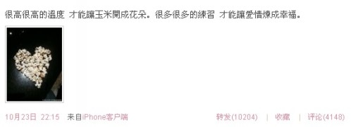 到10月23日的微博中,大S又以爆米花比喻爱情:“很高很高的温度 才能让玉米开成花朵。很多很多的练习才能让爱情炼成幸福。”而在10月25日的感言中,大S更袒露自己的态度:“有些人认识好多年却觉得陌生,有些人见一面就像认识了几辈子,这叫缘份。”莫非是在暗示自己与汪小菲的一见钟情?