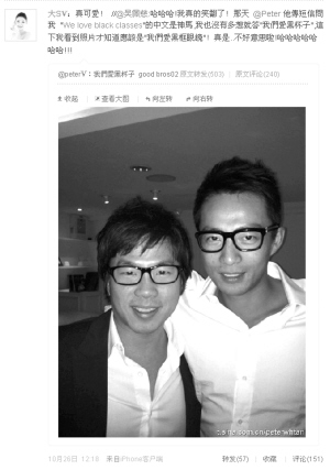 (随即躲猫猫发了张汪小菲的照片)这是汪小菲的照片,能看到笑纹和鼻梁的晒斑,联想吧,还有他们围脖的互动。