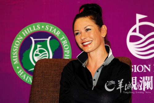 在昨日出席比赛的众多明星中,好莱坞女星凯瑟琳·泽塔·琼斯无疑是最受媒体关注的一个。琼斯与丈夫迈克·道格拉斯都是高尔夫球达人,对于两人的球技较量,凯瑟琳谦虚地说:“丈夫比我打得好多了,不过我打球的姿势比他好看!”