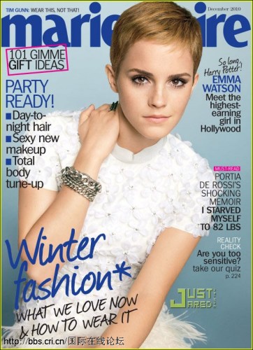 艾玛·沃特森登上杂志《嘉人》封面以短发出镜,俏丽时尚。艾玛说:“其实我16岁时就想剪短发了,当《哈利波特》于6月杀青时,我就想尝试改变形象。这对我来说非常具有象征意义。头发剪得很短,特别是后部和两边。我可以行走街头而不去考虑这件事,这真是一种解放。”谈到成长环境时艾玛说:“我拥有更多自由。以前很困难,父母总是想保护我,但是他们现在也对我没辙了。”