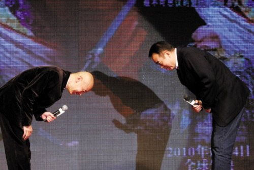 说到动情之处,陈凯歌将葛优请上台,对着葛优深深鞠了一躬。葛优连忙还上一鞠,嘴里念叨着:“接不住!接不住!”陈凯歌说葛优不愿被人恭维,“有一次某制片方给他开庆功会,饭桌上老板使劲夸奖葛优,而葛优却拎起一只大虾的须,笑言自己必须‘牵须(谦虚)’。”